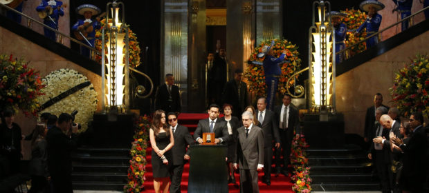 Iván Aguilera, hijo del cantante y compositor mexicano Juan Gabriel, coloca las cenizas de su padre sobre un atril en el Palacio de Bellas Artes, en la Ciudad de México, (AP Foto/Rebecca Blackwell)